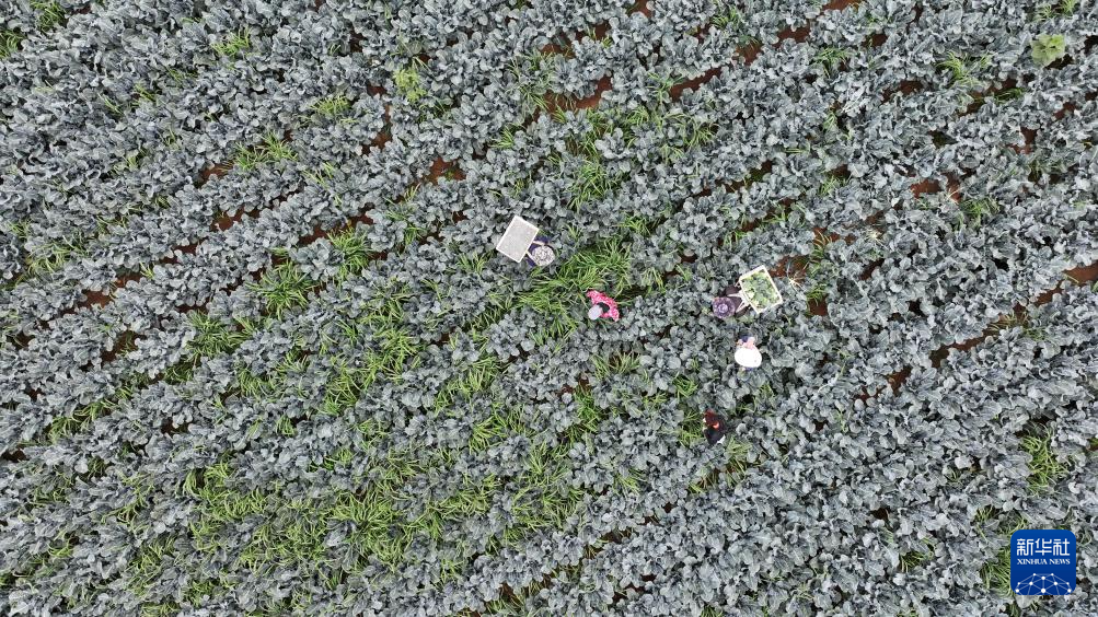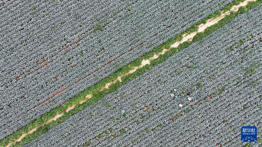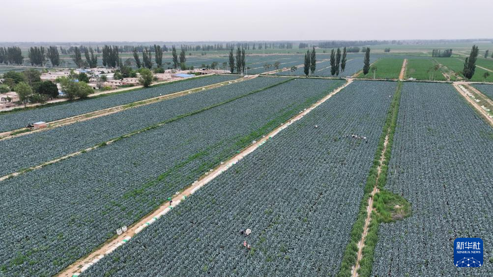 6月20日,工人在位于銀川市賀蘭縣立崗鎮的供港蔬菜種植基地采摘西蘭花(無人機照片)。