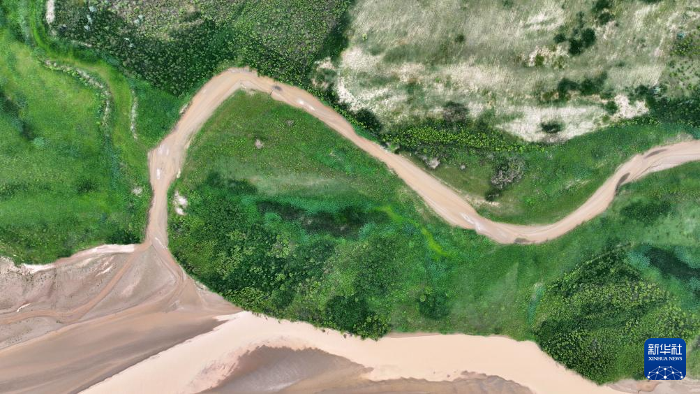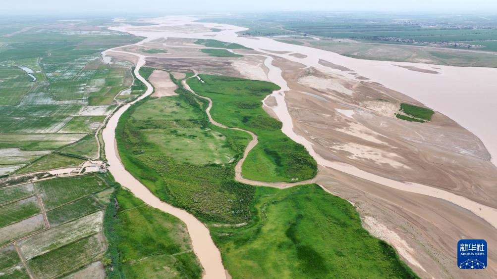 在寧夏賀蘭縣境內拍攝的黃河灘涂濕地(無人機照片,6月22日攝)。