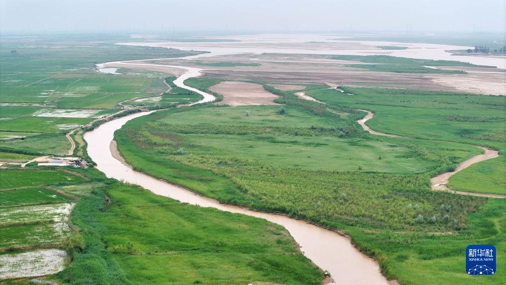 在寧夏賀蘭縣境內拍攝的黃河濱河濕地(無人機照片,6月22日攝)。