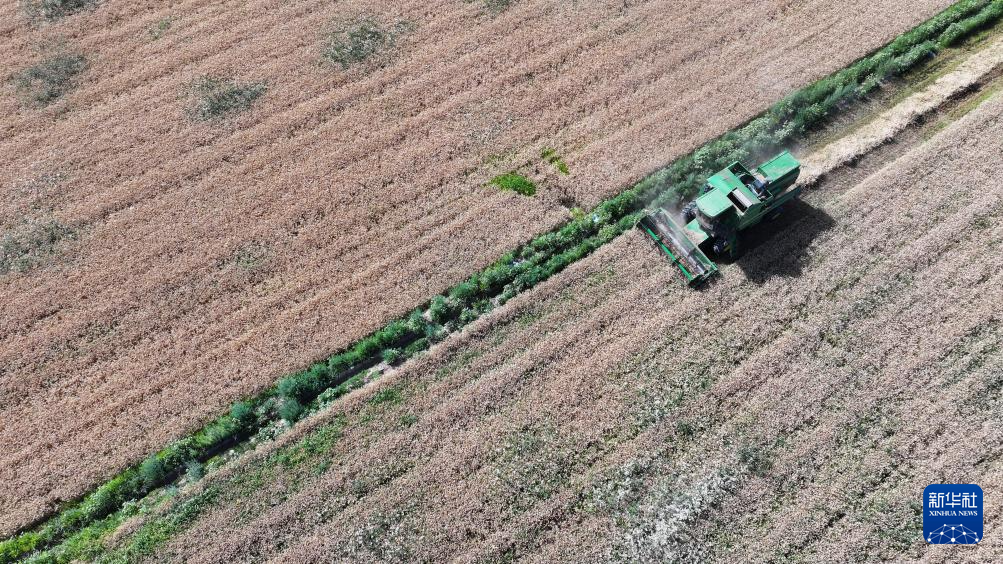 7月15日,收割機在銀川市賀蘭縣立崗鎮蘭星村收獲小麥(無人機照片)。