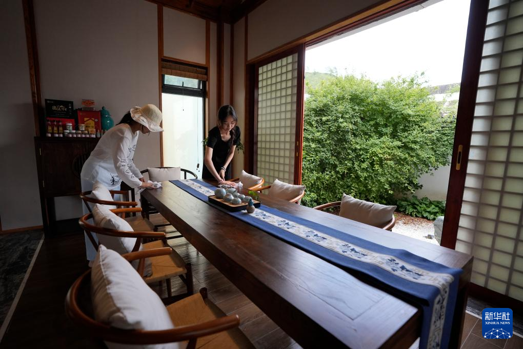 7月19日,工作人員在寧夏固原市涇源縣香水鎮新月村香水風情堡民宿旅游區打掃房間。