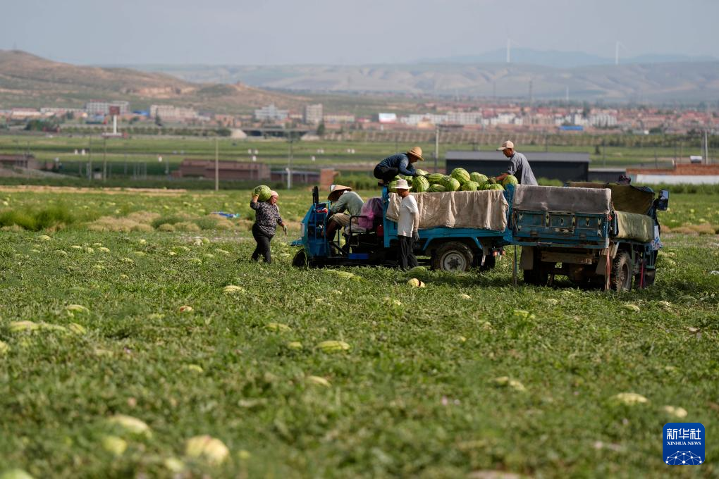 7月20日,農戶在中衛市沙坡頭區興仁鎮采摘、轉運硒砂瓜。