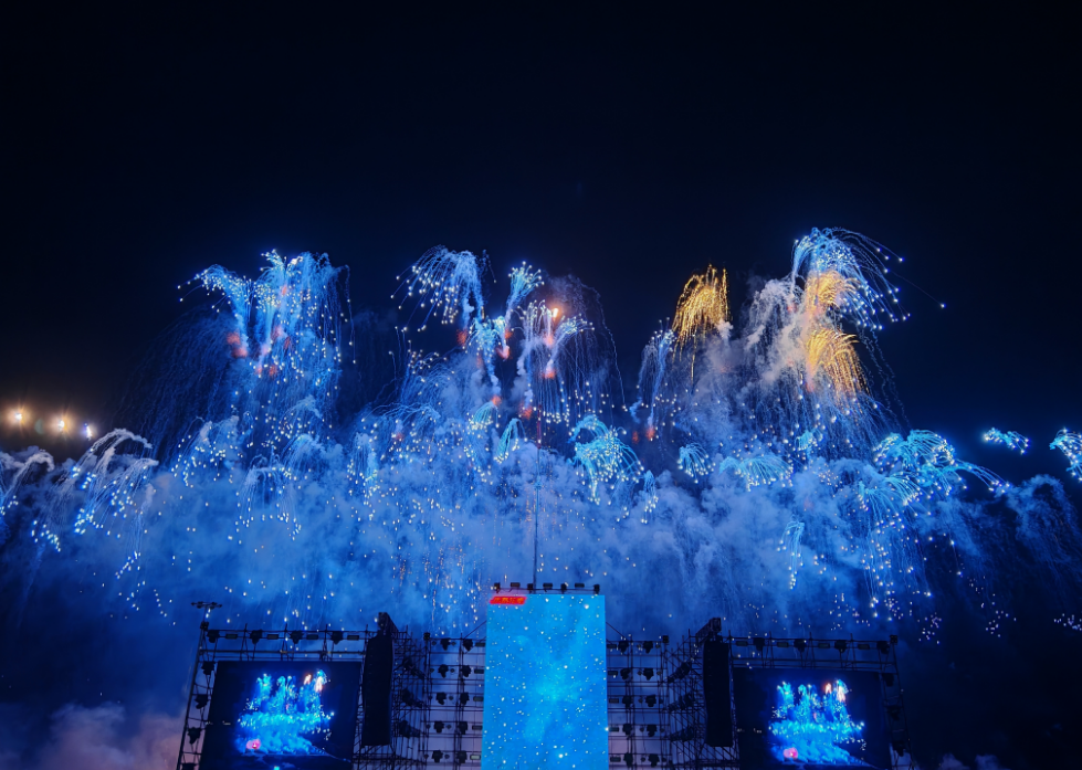 當晚的焰火表演以科技為筆、以夜空為卷,將藝術創意與文化內涵巧妙融合。靜音綻放的煙花如孔雀開屏般溫柔舒展,還原自然之美;向上噴薄的光柱似參天大樹,象征著靈武昂揚向上的城市精神;多色光影交織的“非凡時刻”系列,用朱砂紅、萱草黃、琉璃藍的漸變,勾勒出人生與時代的多彩印記。壓軸登場的大型焰火作品,以精密設計在夜空勾勒出完美光環,用純粹的光影藝術展現著靈武對高品質文化活動的追求,讓觀眾沉浸式感受科技與藝術碰撞的震撼。