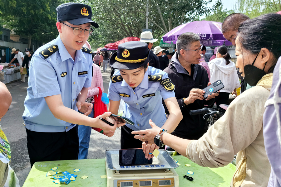 創新普法宣傳,推進服務型執法。聚焦電子秤“缺斤短兩”問題,聯合多部門在轄區早市、農貿市場先后開展“手機變砝碼,計量惠民生”活動20余場次,現場免費為群眾張貼標簽,幫助消費者辨別“鬼秤”,有力的打擊了不法商販。目前,“手機變砝碼”宣傳活動已作為先進做法在全市范圍內進行廣泛推廣,這項舉措切實提升了消費者識假防詐和維權便捷性,使計量監管更加惠及民生,積極營造共建共治共享的計量良好氛圍,不斷提升服務效能。