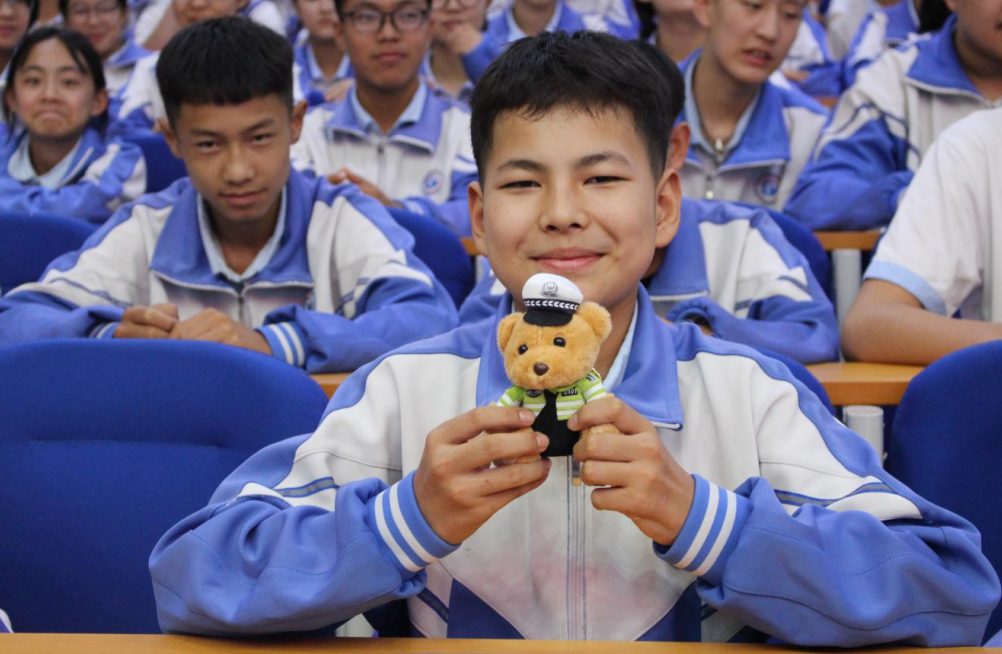 互動問答、情景模擬等環節點燃了同學們的參與熱情?!膀T行電動車過馬路時,應該先看哪個方向?”面對民警郝龍的提問,同學們積極舉手搶答,答對者獲得頭盔、交警小熊、文件袋、安全手冊等小禮品。