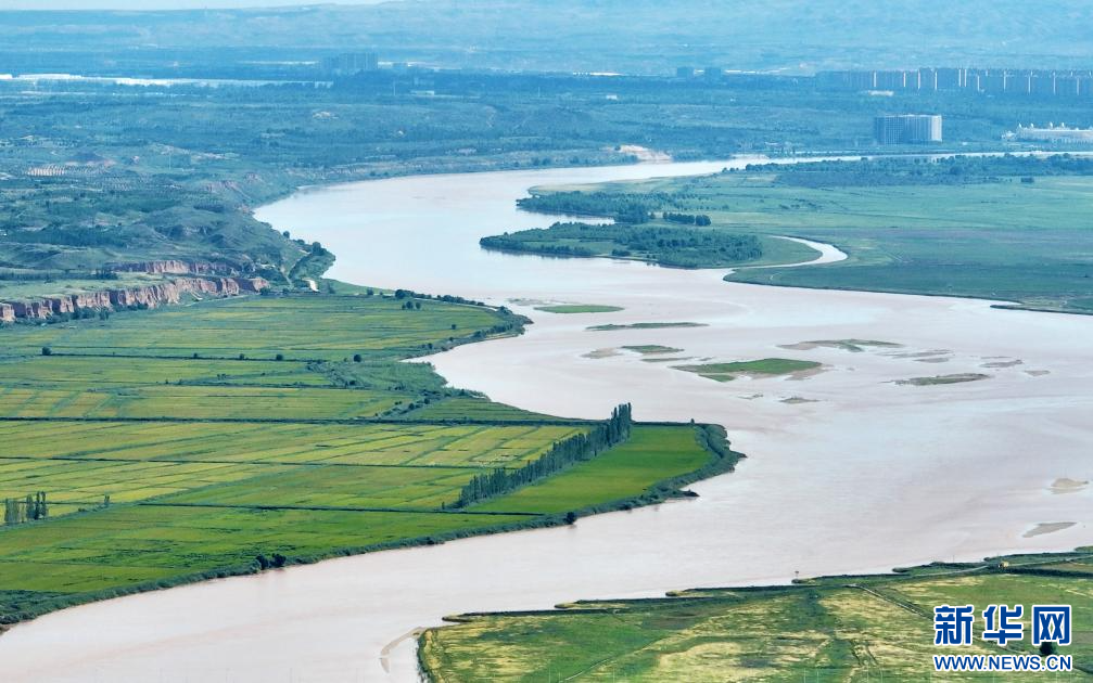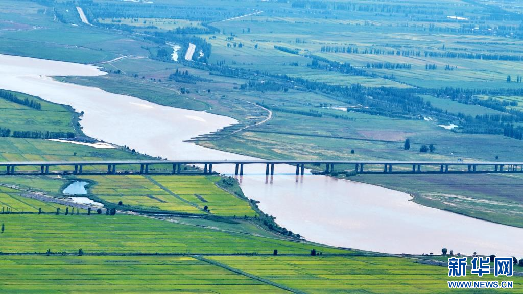 在黃河銀川段,兩岸農田與蜿蜒黃河、道路及橋梁互相映襯,構成一幅“塞上江南”生態美景。