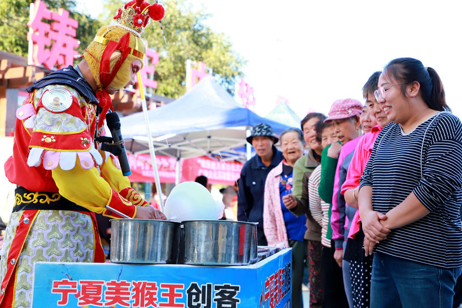 活動在歡快鑼鼓聲中拉開帷幕,群眾自編自演的表演唱《移風易俗樹新風》、小合唱《走進新時代》以及器樂合奏《塞上江南寧夏美》等文藝節目,生動展現了新時代農民積極向上的精神風貌。寧夏文聯“強基工程”文藝志愿服務隊“時代風尚”專場演出火熱助興,歌舞《春滿人間百花開》《豐收中國年》《新花兒與少年》、女聲獨唱《幸福贊歌》等節目接連登場,特別是男女聲二重唱《我引綠洲接長河》以激昂的演唱,將活動現場氣氛推向高潮。