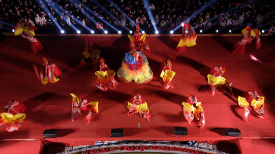 民樂演奏《象王行》中,以“象”為意象,形成主舞臺與玉皇閣上器樂對奏格局,融合傳統民樂與現代視聽技術,以“聲音之鼎”傳遞歷史厚重的盛世氣象,鳴響時代文化復興強音。舞蹈《絲路飛天》從石窟中引來飛綢舞,以蹁躚舞姿話千年歷史。詩詞朗誦《將進酒》《醉翁亭記》則將中秋賞月、觀潮、燃燈的傳統風俗融入詩情畫意之景中,賞古詩中的明月,品文化中的佳肴。