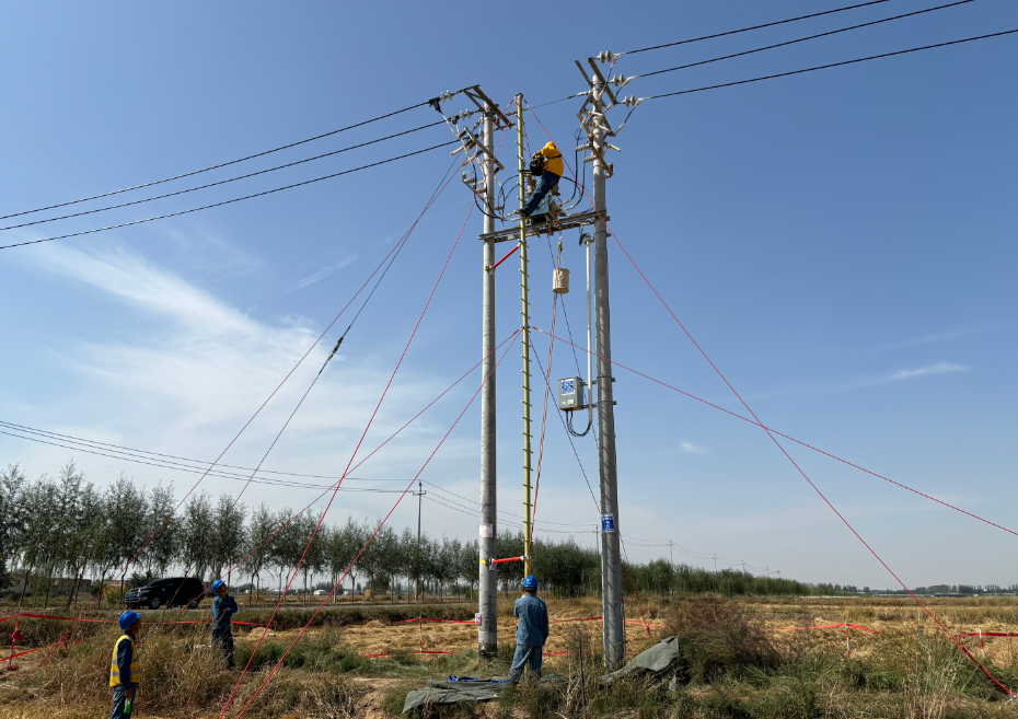 作業過程中,帶電作業班成員在農田中對“蜈蚣梯”進行定位打樁、逐節組裝并用絕緣纜風繩固定,將近12米高的“蜈蚣梯”平穩立在目標桿位附近。作業人員依托“蜈蚣梯”的穩定支撐,在高空對故障設備進行了精準、高效的帶電更換,實現了對聯絡開關的不停電檢修,保障了線路之間的正常負荷轉供能力,避免了因設備故障可能導致的用戶停電,確保了區域電網的連續穩定運行。