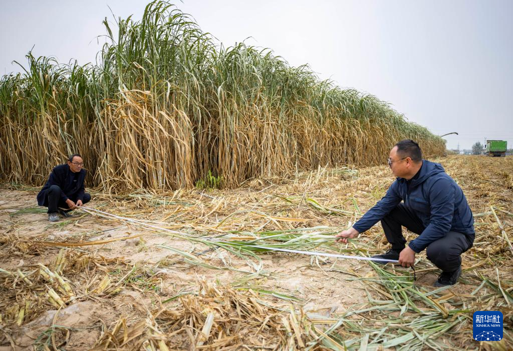 10月23日,在寧夏銀川市永寧縣閩寧鎮園藝村,技術人員測量巨菌草的生長數據。