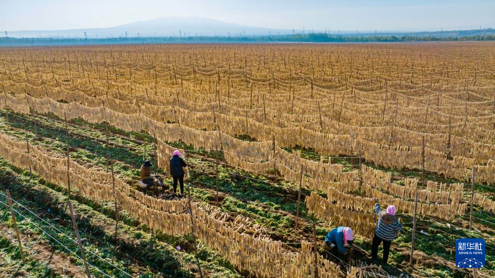 10月29日,農民在寧夏吳忠市紅寺堡區紅寺堡鎮弘德村晾曬蘿卜條。