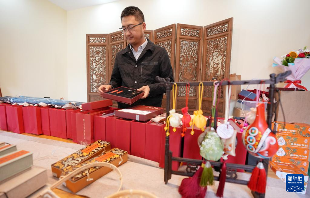 返鄉創業青年石磊在隆德縣城關鎮楊家店村向游客介紹文創產品(10月26日攝)。